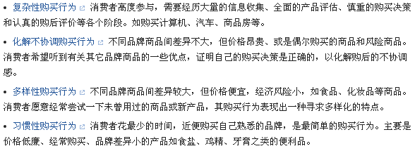 從上面可以見到,我們根據(jù)購買者的參與程度和產(chǎn)品品牌差異程度可以區(qū)分出四種購買類型: